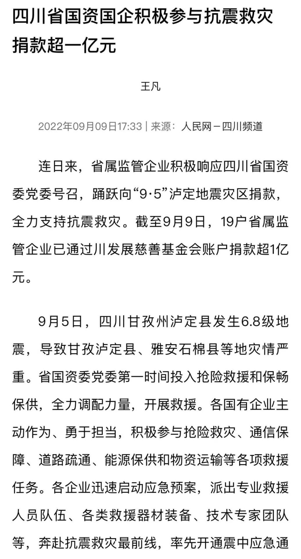 連日來(lái),省屬監(jiān)管企業(yè)積極響應(yīng)四川省國(guó)資委黨委號(hào)召,踴躍向“9·5”瀘定地震災(zāi)區(qū)捐款,全力支持抗震救災(zāi)。截至9月9日,19戶省屬監(jiān)管企業(yè)已通過(guò)川發(fā)展慈善基金會(huì)賬戶捐款超1億元。
