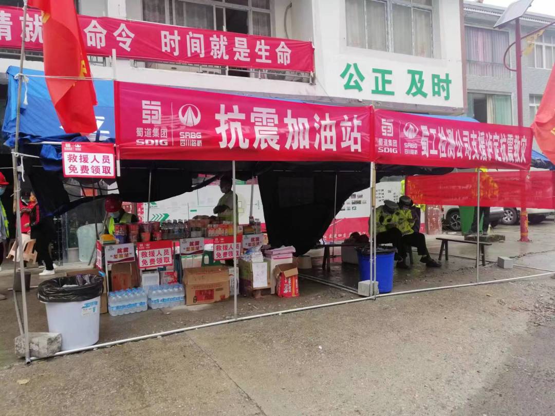 得知該情況后,蜀工檢測公司在四川路橋交建集團(tuán)的指揮下,迅速行動(dòng),精心組織,在地震后第一時(shí)間,搭建起了“抗震加油站”,為來往參與救災(zāi)的工作人員和受災(zāi)群眾免費(fèi)提供食物、水、藥品以及充電服務(wù),極大地方便了附近的救災(zāi)工作。