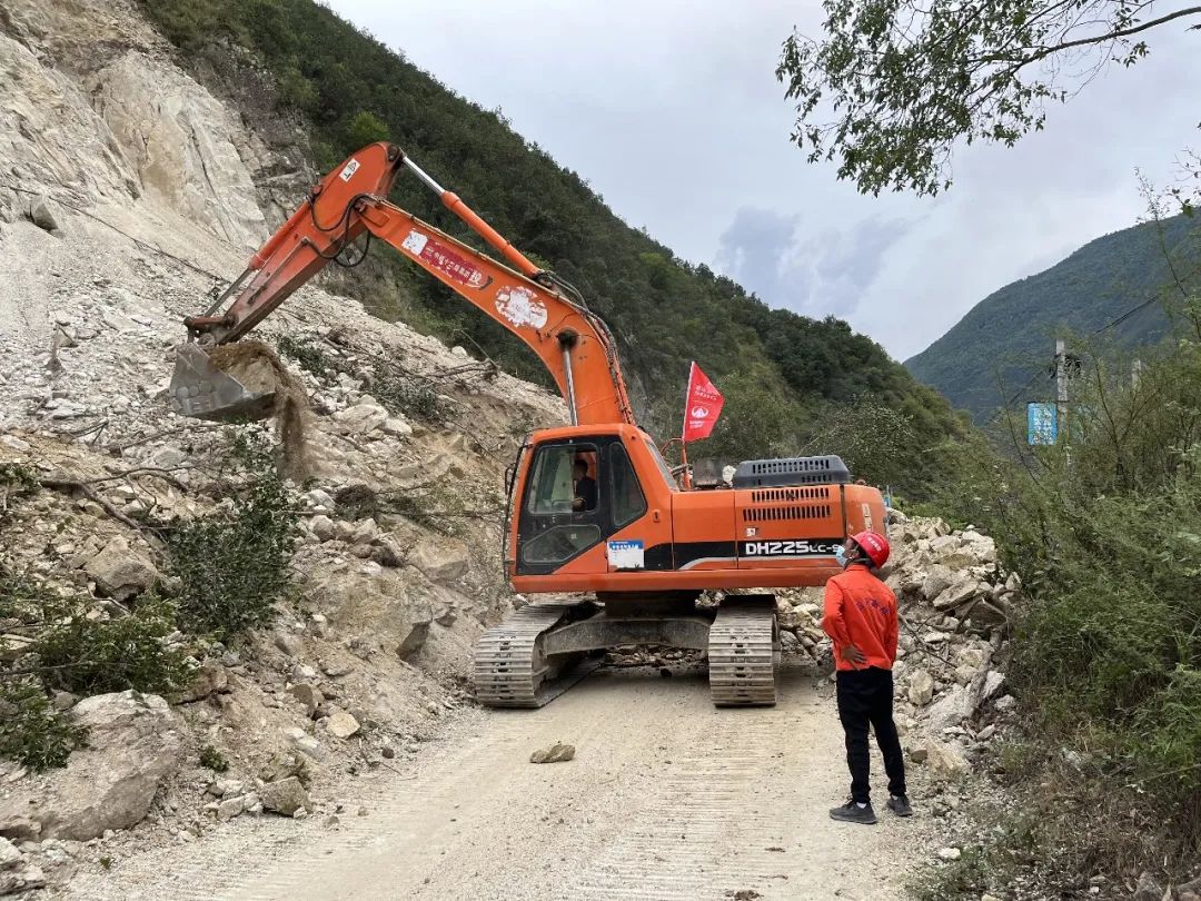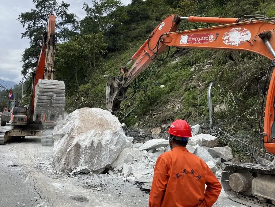 9 月 日,王海燕拿著對講機調(diào)動人員、設(shè)備前往省道 S434 金光村至磨西鎮(zhèn)段,突擊隊在亂石嶙峋的道路上顛簸了一個多小時后,他們被一塊巨石擋住了去路,這塊從山上飛落的巨石,深陷入地1.5 米左右、足足 600 余噸,要打通這條道路,必須“啃掉”這只攔路虎。王海燕和團隊根據(jù)現(xiàn)場情況,最終確定利用破碎式挖掘機將巨石“啃碎”的處置方案,確定方案后王海燕一邊招呼著車輛靠邊臨停,一邊以巨石為中心,在左右各100米的路段中來回快走,不停地判斷塌方山體危險點位,幾分鐘后,他設(shè)置好6個安全崗哨,便開始了搶通工作。雖然王海燕和挖掘機操作手配合默契,但巨石破碎過程卻異常緩慢,經(jīng)過突擊隊4個小時的努力,終于啃下這塊巨大的“硬骨頭”,成功完成了得妥鎮(zhèn)金光村至磨西鎮(zhèn)段抗震救援通道搶通保暢工作。