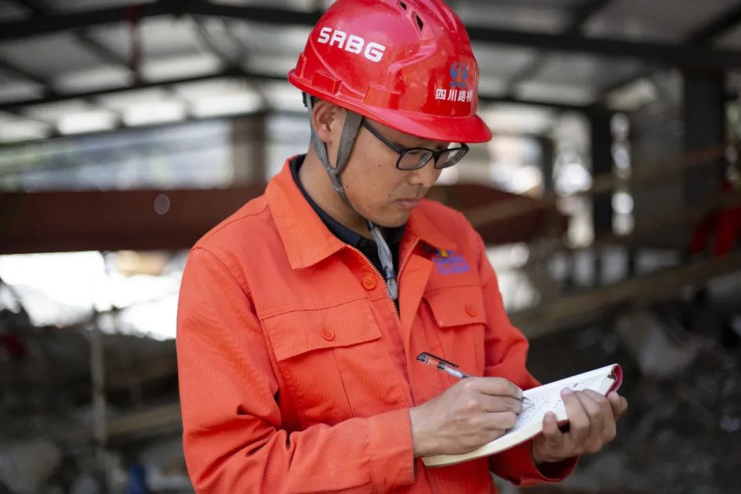 他口中緊咬著半塊面包,騰出來(lái)的雙手,一只手捏著本子,另一只手握著筆來(lái)回寫畫著……自“9·5”瀘定地震發(fā)生后,鄧嘉的每頓午飯幾乎都是在各個(gè)搶險(xiǎn)點(diǎn)啃著干糧解決的。作為四川路橋華東公司瀘石高速C1總包部的副總工,他的任務(wù)就是在各個(gè)搶險(xiǎn)點(diǎn)位勘探道路及初擬搶險(xiǎn)方案,為搶險(xiǎn)隊(duì)快速搶通道路爭(zhēng)取更多時(shí)間。