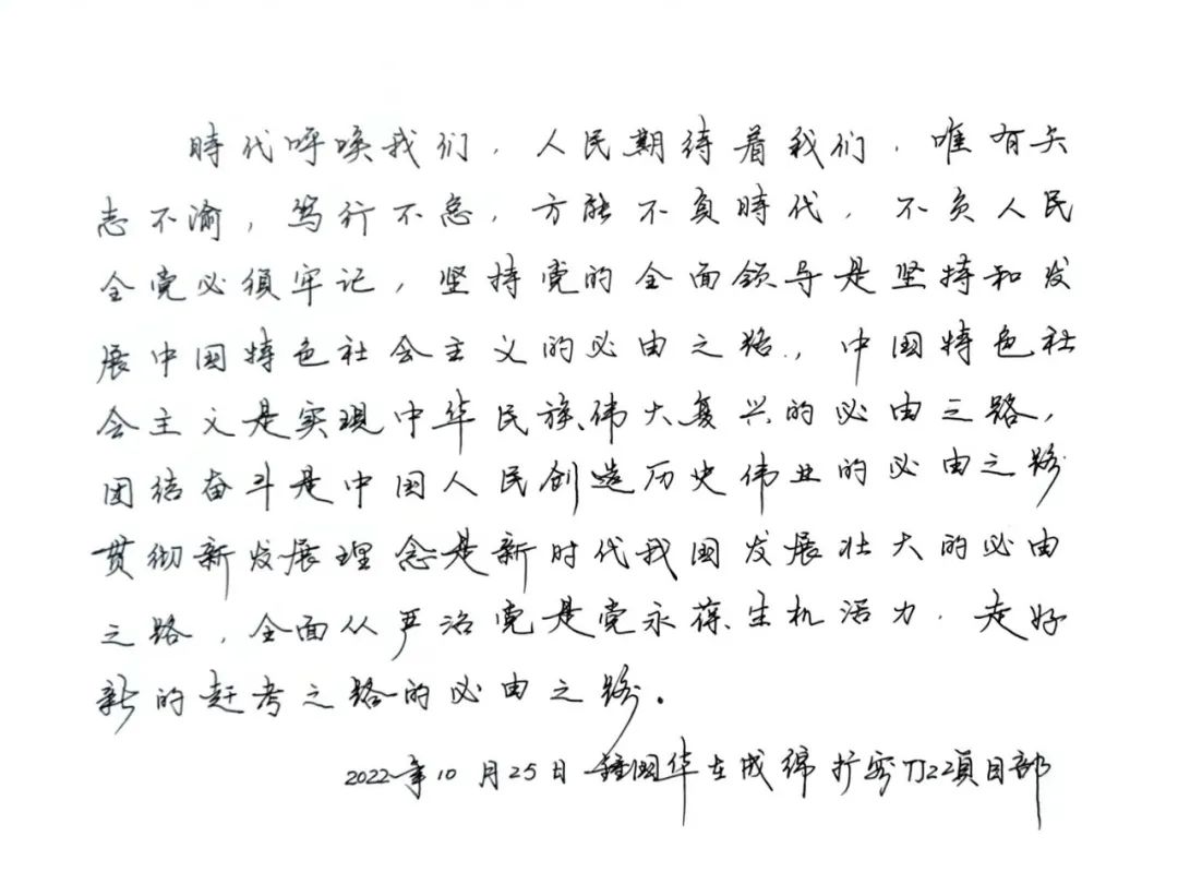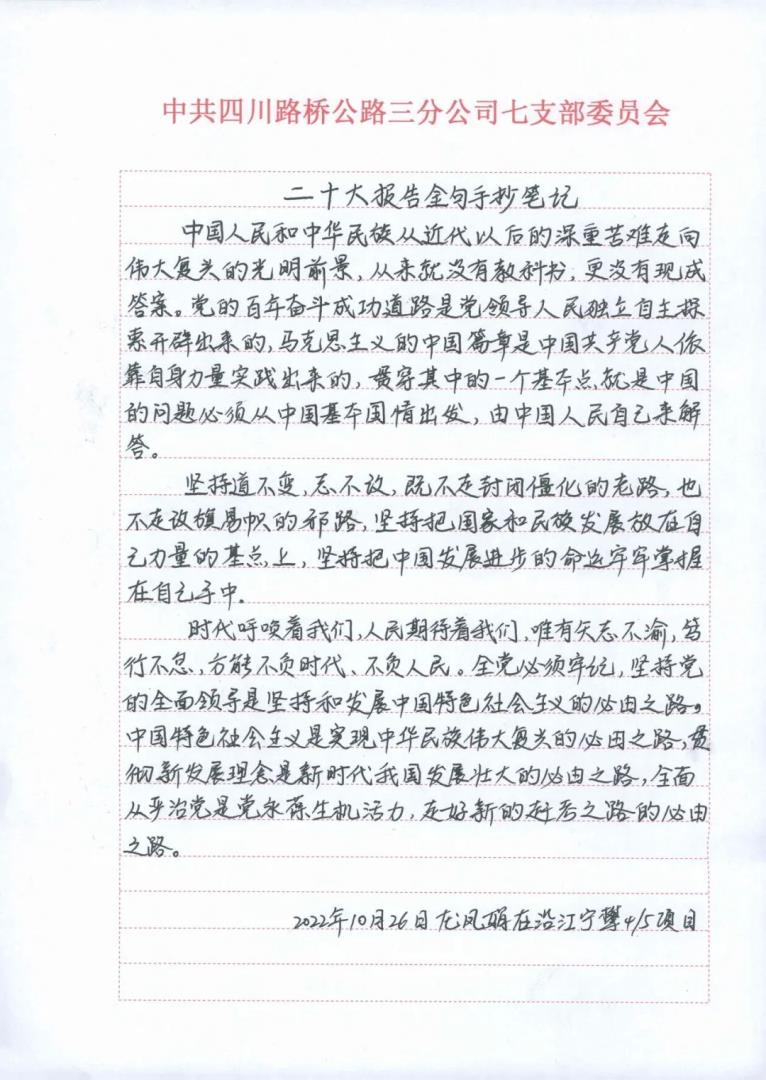 近日,四川路橋各直屬企業(yè)黨組織積極開展“手抄黨的二十大金句”活動,廣大黨員干部職工通過邊抄、邊記、邊學(xué)的方式,真正做到了把黨的二十大報告精神學(xué)全、學(xué)深、學(xué)透。