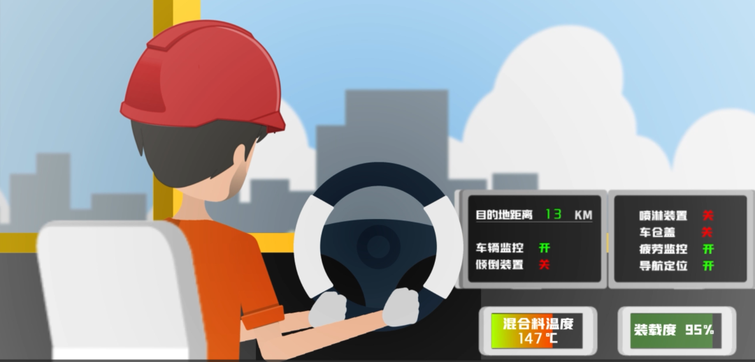 采用節(jié)能環(huán)保的智能環(huán)保運(yùn)輸車,車廂采用隔離劑自動(dòng)噴淋裝置,通過減少人工噴淋環(huán)節(jié),實(shí)現(xiàn)減少人工、提高施工效率的目的。智能環(huán)保運(yùn)輸車通過艙蓋關(guān)閉與保溫板的裹覆達(dá)到車廂內(nèi)的保溫效果,運(yùn)輸過程中通過安裝在車廂內(nèi)的溫度檢測(cè)裝置,實(shí)時(shí)監(jiān)控瀝青混凝土溫度,確保攤鋪現(xiàn)場瀝青混合料溫度處于可控范圍內(nèi),監(jiān)控信息實(shí)時(shí)傳輸至車輛顯示屏及主控屏幕,車廂內(nèi)物料溫度臨近預(yù)設(shè)值,系統(tǒng)會(huì)自動(dòng)預(yù)警(140度),并提醒司機(jī)盡快趕到施工現(xiàn)場裝卸物料或采取相應(yīng)措施。如溫度低于預(yù)設(shè)值(130度),系統(tǒng)會(huì)提醒司機(jī)及管理人員,該物料溫度過低無法使用。成品瀝青混合料通過卸料口與自動(dòng)移車平臺(tái)進(jìn)行聯(lián)動(dòng)作業(yè),保證裝料平整度,避免物料離析,封閉式自動(dòng)裝車裝置不僅保護(hù)了駕駛員的健康,同時(shí)將產(chǎn)生的油煙收集后進(jìn)行處理達(dá)標(biāo)后再排放。