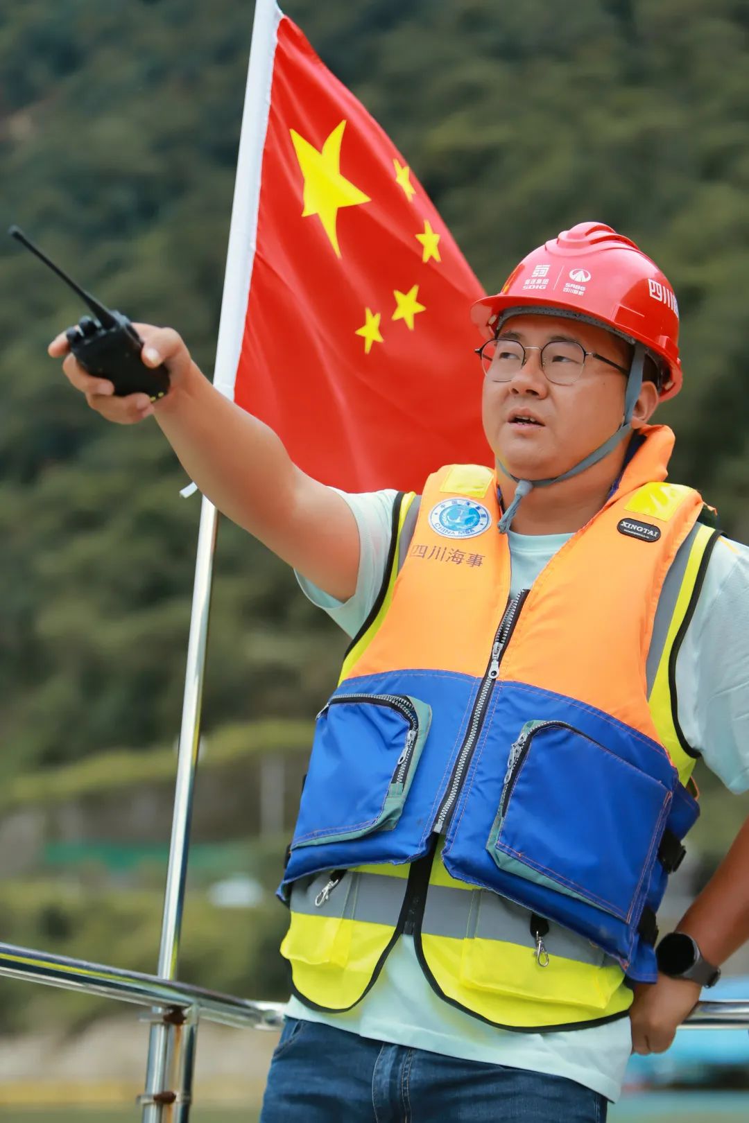 “我覺得用逆行都不能形容我的兄弟伙,別個(gè)在逃命,我們?cè)谕婷 痹谑┕がF(xiàn)場(chǎng),秦智指著隨時(shí)有滑坡危險(xiǎn)的山體介紹。正如秦智所言,他們所負(fù)責(zé)的S217省道王崗坪鄉(xiāng)至聯(lián)合村大橋這一段搶通道路,長(zhǎng)度僅有19公里,但卻有大小塌方點(diǎn)十余處,而多數(shù)塌方點(diǎn)上方山體完全垮塌,路面完全被碎石和泥土掩埋,距離他們不足一公里的一個(gè)塌方點(diǎn)更是路基、路面全部消失不見。就在搶通工作正式開始后的第二天,他們看到面前的整條道路已經(jīng)完全被垮塌的山體掩埋,而整個(gè)垮塌體完全由松軟的淺表土層組成,挖掘機(jī)上去后,挖取一片,上方就滑落一片,隨挖隨垮,如果強(qiáng)行通過,挖掘機(jī)有被掩埋的風(fēng)險(xiǎn)。面對(duì)難題,現(xiàn)場(chǎng)人員氣氛凝重,在幾經(jīng)實(shí)驗(yàn)無果后,邀請(qǐng)來自四川交通設(shè)計(jì)院的專家來現(xiàn)場(chǎng)指導(dǎo),經(jīng)過仔細(xì)分析,有著豐富現(xiàn)場(chǎng)施工經(jīng)驗(yàn)的秦智提出采用長(zhǎng)臂挖掘機(jī),超距離作業(yè),增加路上安全觀察點(diǎn)位,新增水上觀察點(diǎn)位,雙重保護(hù),提前預(yù)判,最大限度避免風(fēng)險(xiǎn)發(fā)生。于是,在四川路橋交建集團(tuán)搶險(xiǎn)救災(zāi)的歷史上,第一次出現(xiàn)了水面安全員這一設(shè)置,他們?cè)谡麄€(gè)搶通期間,堅(jiān)守在大渡河上,守護(hù)作業(yè)人員安全,最終搶通隊(duì)伍順利通過這一攔路虎。