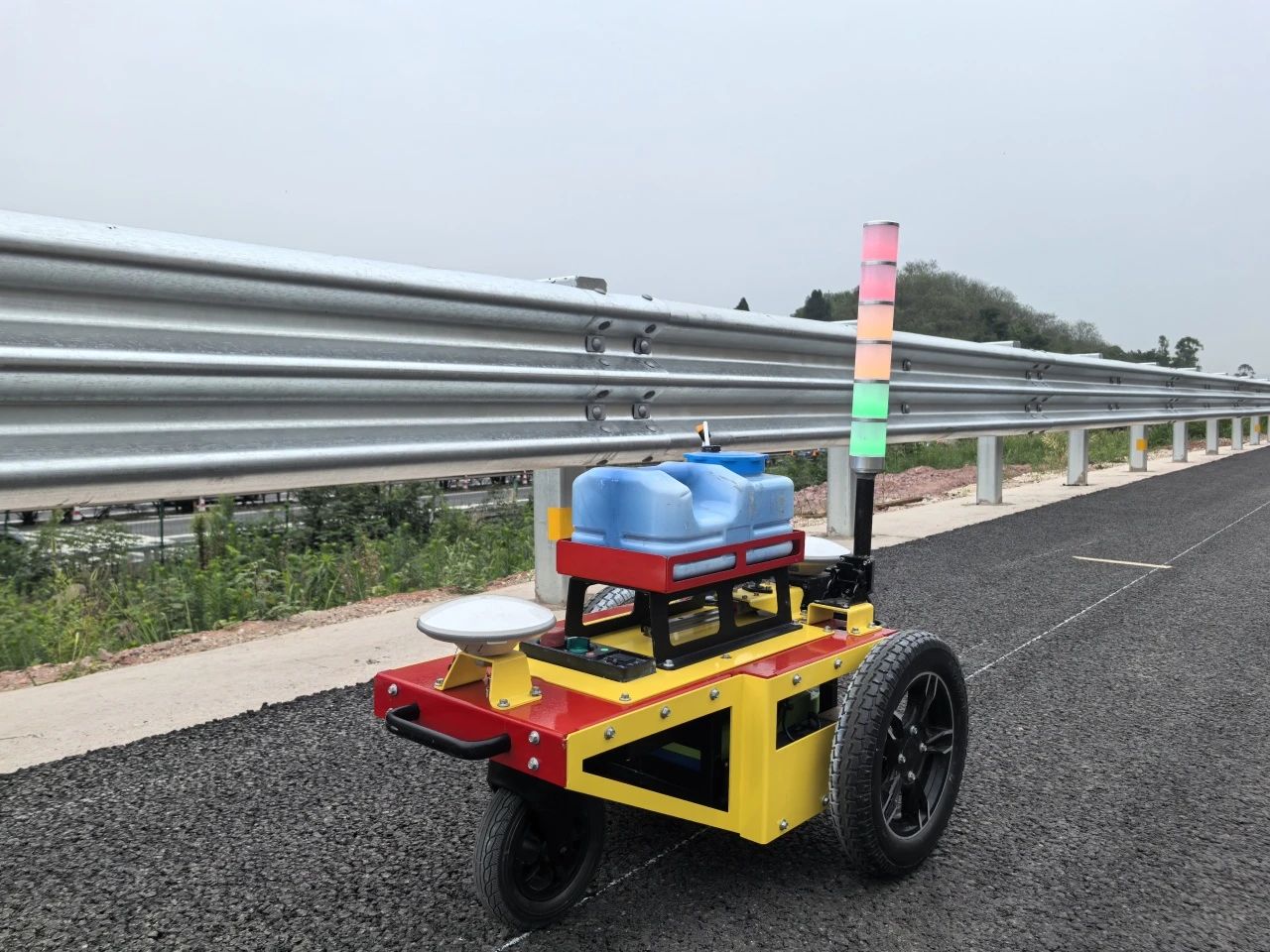 測(cè)試過(guò)程中,自動(dòng)放樣機(jī)器人自動(dòng)沿規(guī)劃路徑移動(dòng),機(jī)器臂末端向路面噴墨標(biāo)記路線,最終實(shí)現(xiàn)重復(fù)定位精度優(yōu)于±1cm,滿足了放樣施工的高精度要求。同時(shí),在傳統(tǒng)模式下,人工放樣平均速度約為5-10米/分鐘,且需兩人配合完成,而自動(dòng)放樣機(jī)器人放樣速度高達(dá)40米/分鐘,效率提升了4至8倍,不僅大幅縮短了施工時(shí)間、有效降低了人力成本,更保障了交安設(shè)施布設(shè)的規(guī)范性與安全性。